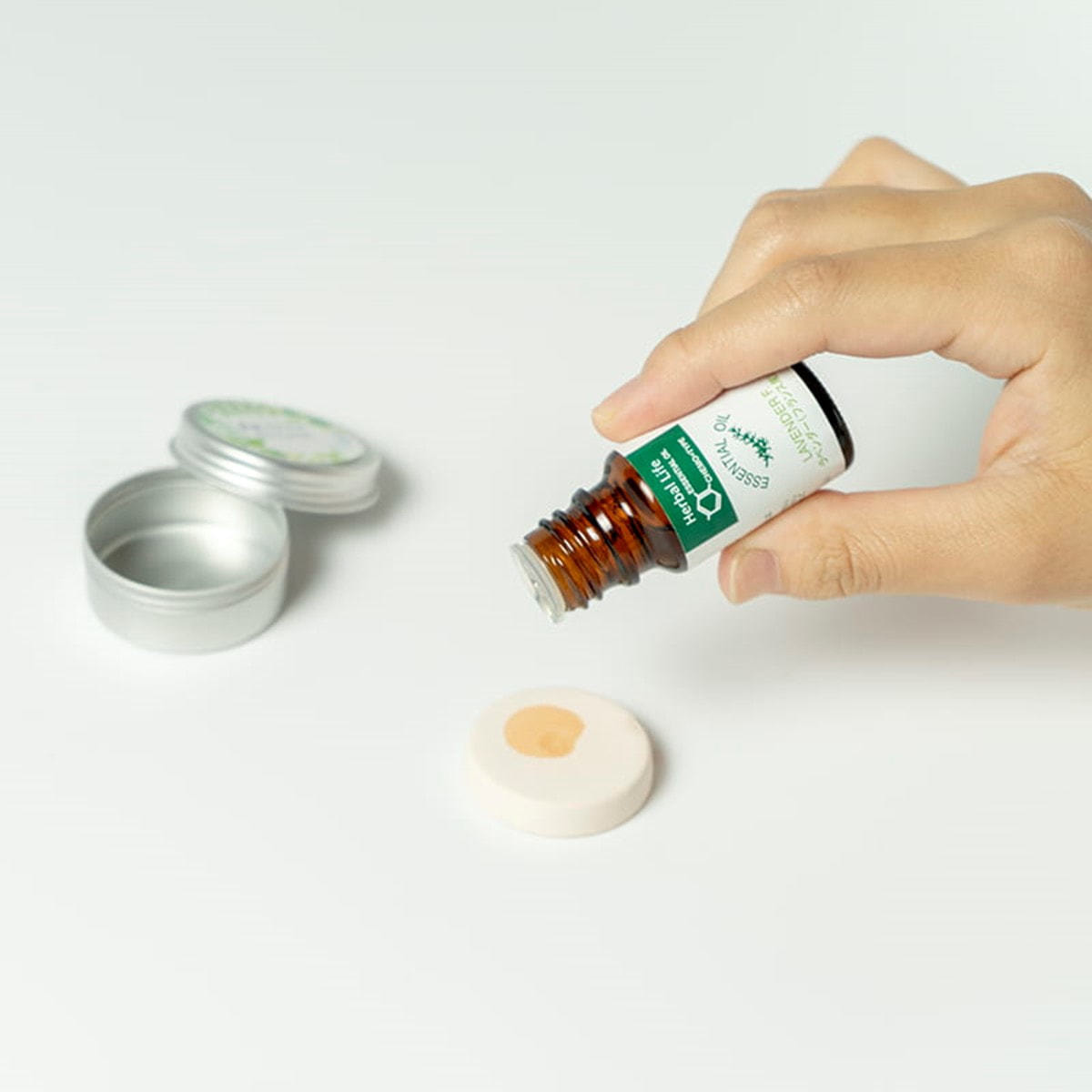 2.ストーンにエッセンシャルオイル(精油)が浸み込んだら、アルミケースのフタを締め携帯していただけます。