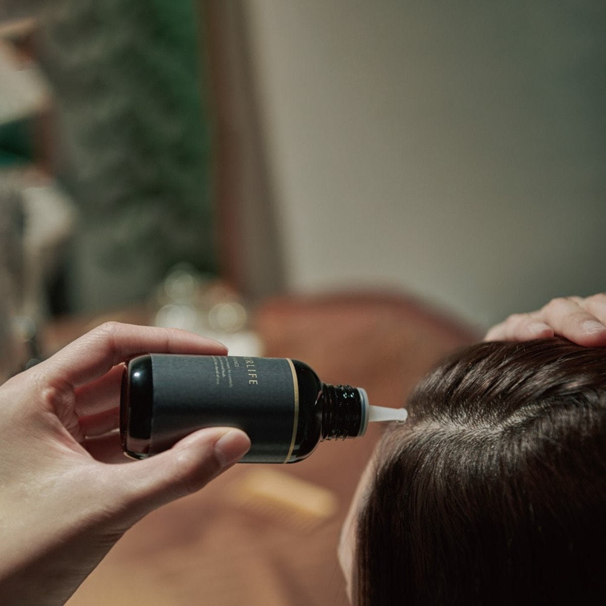 ※頭皮にノズルの先端をあてて内容物が頭皮全体にいきわたるように塗布し、指の腹でマッサージするようになじませます。